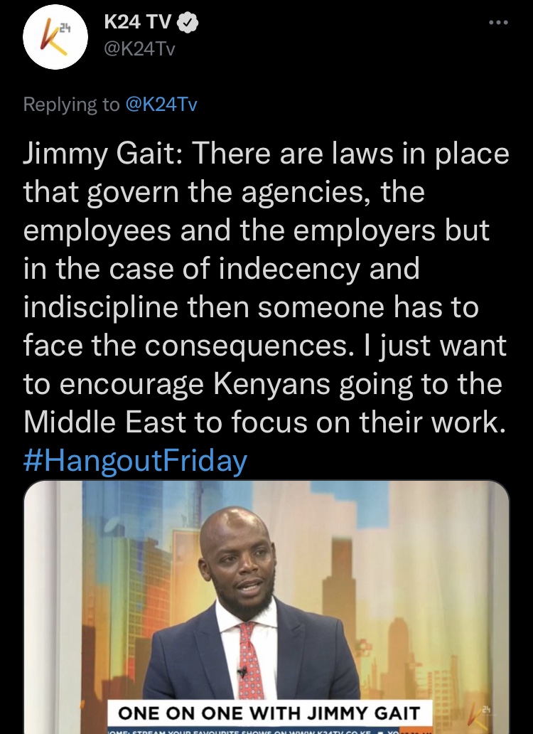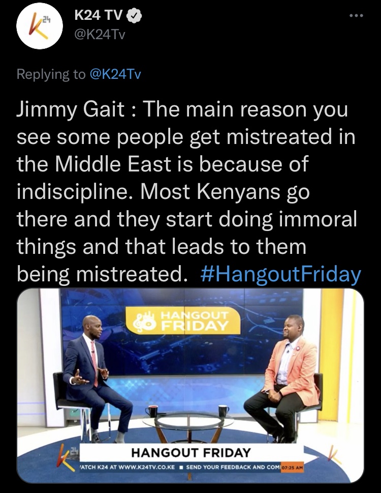 Earlier this morning Jimmy Gait held a candid interview on K24; and I am thinking, he either woke up high or is not in his right mind that is judging from what he said about Kenyan female house helps working in Saudi Arabia.