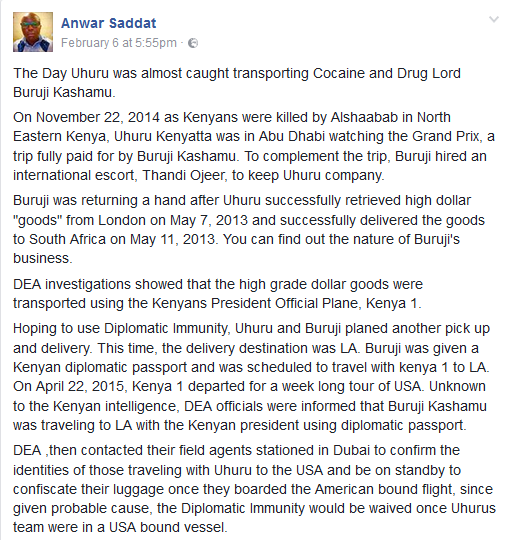 Saddat claim Uhuru’s plane was turned around because it was transporting cocaine and a Nigerian drug lord-cum-senator, Buruji Kashamu.